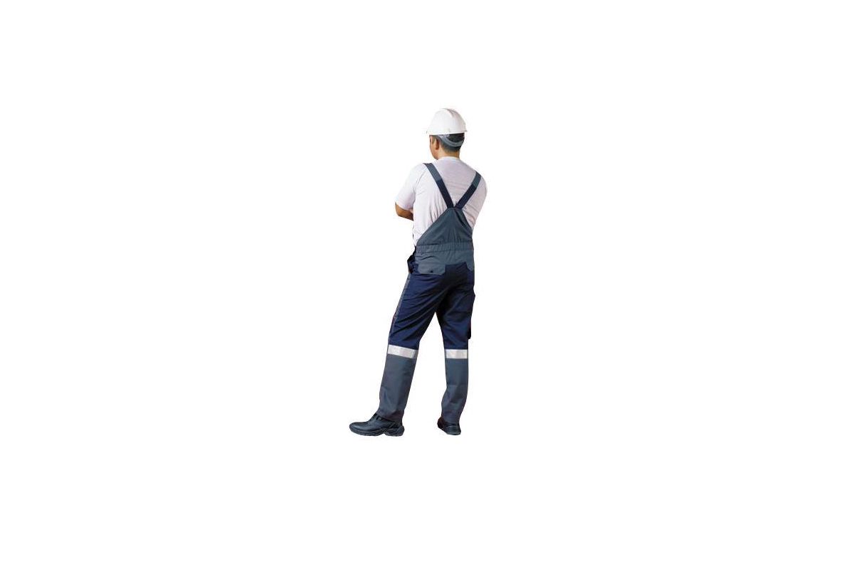 Полукомбинезон прямого силуэта с центральной застежкой на пуговицы и боковыми застежками на кнопки. На задних половинках полукомбинезона ширина по талии регулируется эластичной тесьмой. Передние половинки полукомбинезона с карманами; с наколенниками, выстеганными с прокладкой из вспененного полиэтилена. На нагрудной части полукомбинезона накладной карман с клапаном, с отделениями «под карандаш» и объемным отделением для мобильного телефона. Задние половинки с кокетками, накладными карманами, лентой СВ. На левой задней половинке – лямка под молоток. Ткань: ТОМБОЙ (Tomboy,пр-во Carrington, Англия), отделка ''легкий уход''. Цвет: синий с серым.