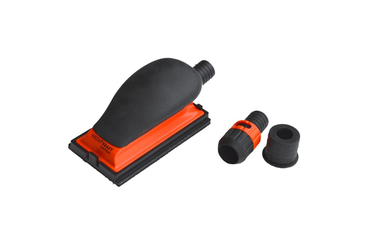 Универсальный шлифовальный набор для изогнутых поверхностей. Комплект из основного блока держателя с пылеотводом и 4 сменных насадок различного профиля. Размер 70х125мм, 13 отверстий.