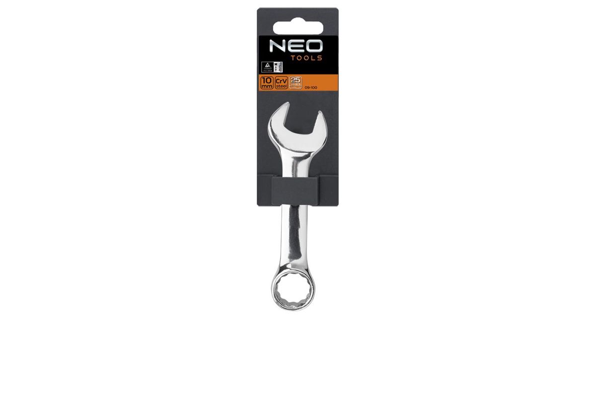 Комбинированный ключ NEO изготовлен в соответствии с требованиями стандарта DIN 3113. Высокосортная хромованадиевая сталь обеспечивает долгий срок службы ключа. Короткое плечо облегчает работу в труднодоступных местах. Качество инструмента подтверждено сертификатом TUV и 25-летней гарантией производителя. Бренд NEO оправдывает ожидания профессионалов.
