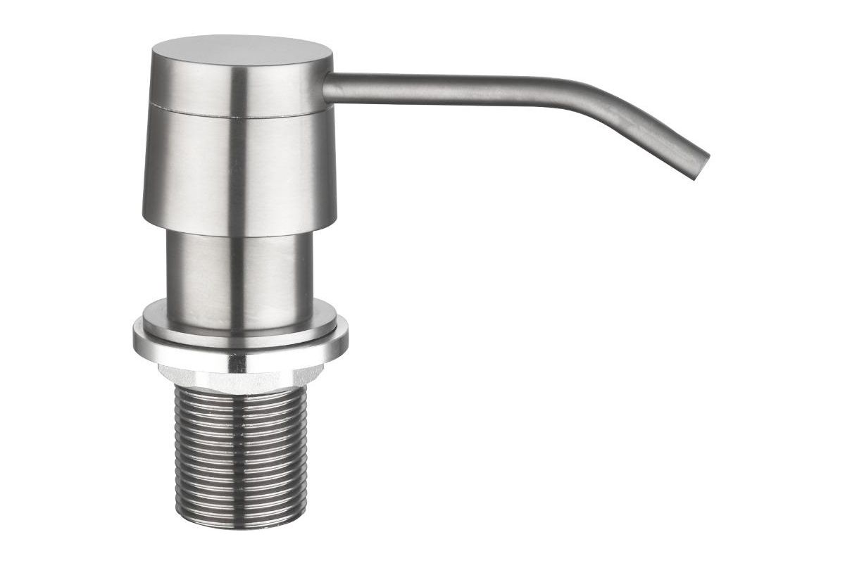 Дозатор для жидкого средства выполнен из нержавеющей стали, система пополнения уровня жидкости: сверху. Диаметр монтажного отверстия: 25 мм. Возможна установка в отверстие 35 мм. Колба: пластиковая. Объем: 300 мл. Установка на поверхности мойки или на столешнице толщиной до 30 мм. Высота над уровнем поверхности: 100 мм. Длина излива: 90 мм.