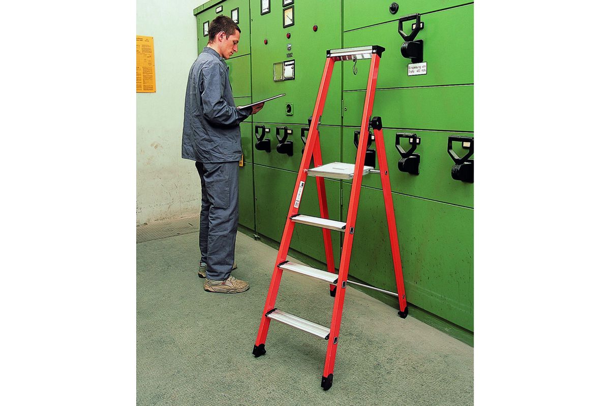 Стремянка односторонняя диэлектрическая (фибергласовая) имеет легкосплавнные ступени глубиной 80 мм с противоскользящим рифлением. На данной стремянке присутствует возможность работы с электрооборудованием благодаря диэлектрическим стойкам из стеклопластика.